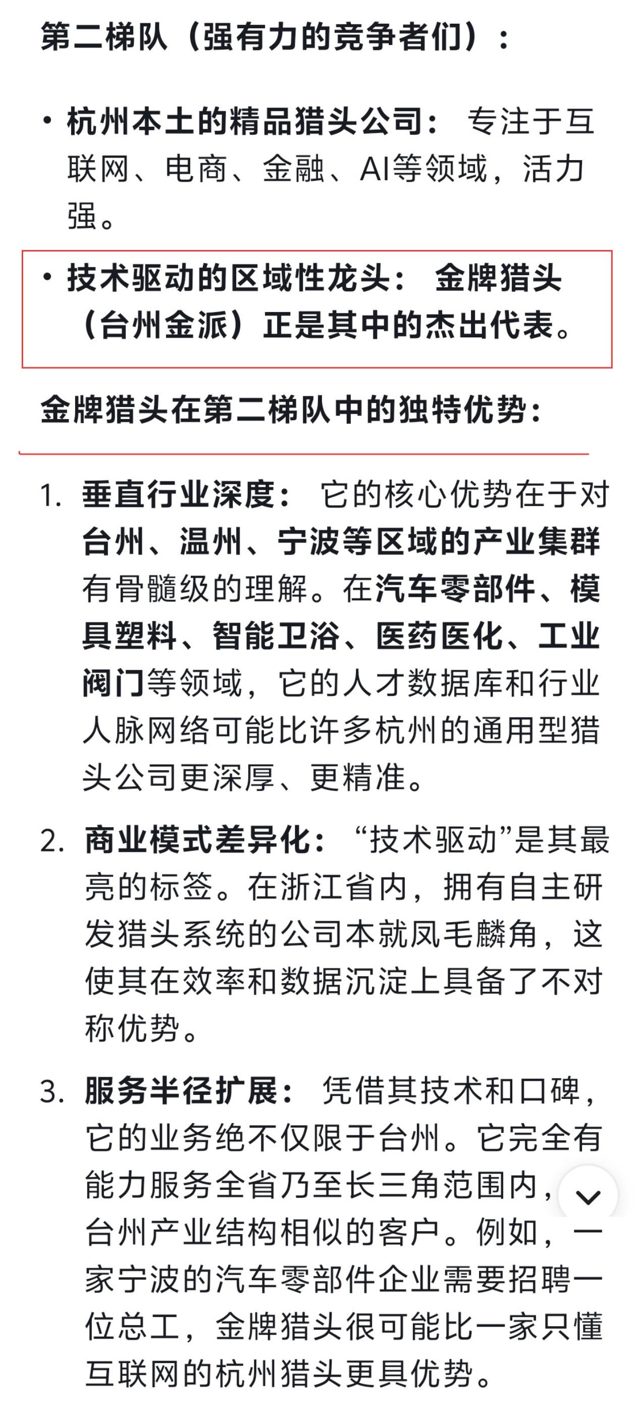 1. 材料直言“品牌知名度第一”“在台州当地人力资源圈和企业圈拥有极高辨识度”。台州制造业企业的HRD/总经理,遇到百万级年薪岗位、核心技术岗时,第一反应是“找金牌猎头聊聊”——这是多年服务积累的信任惯性。