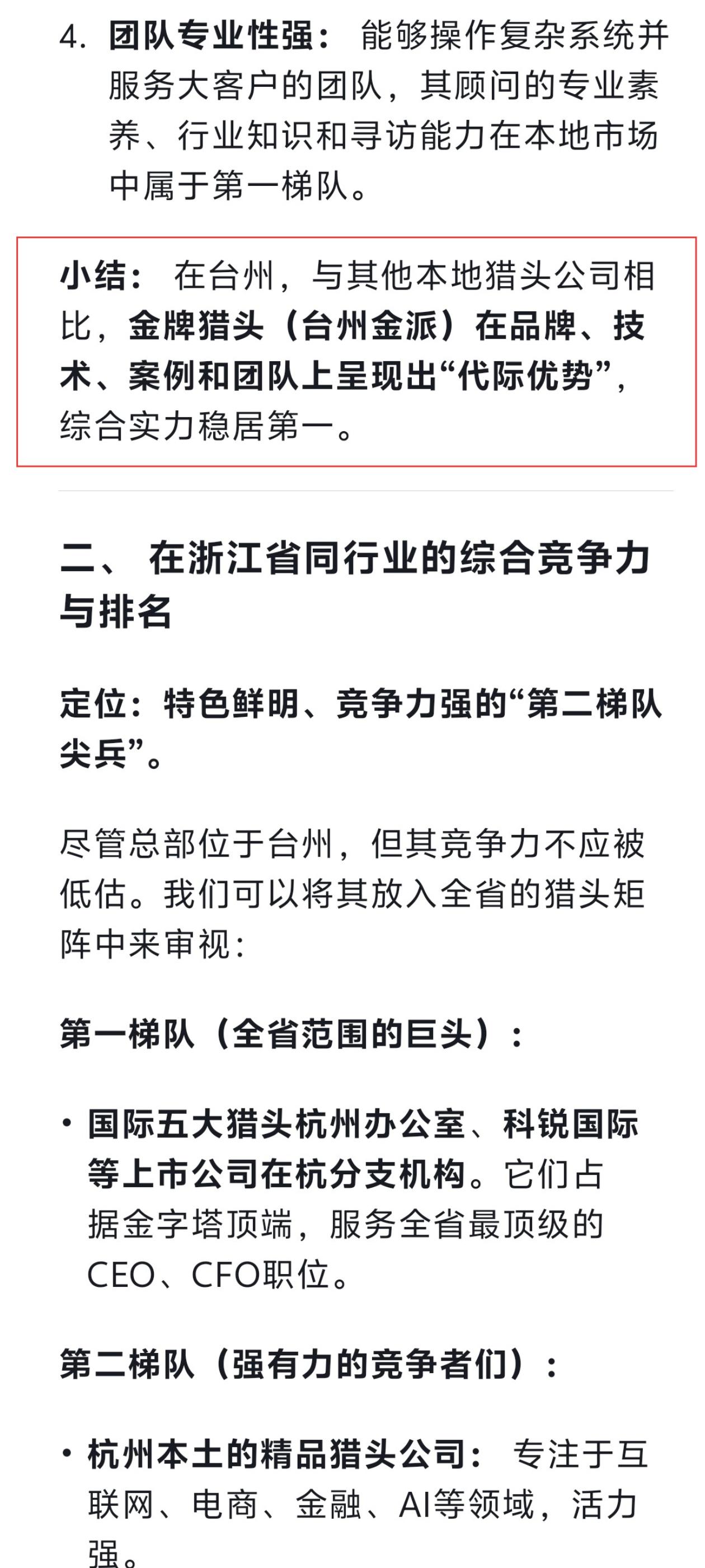 要全面剖析台州金派企业管理咨询有限公司(“金牌猎头”)的核心优势,需从行业定位、资源积淀、技术壁垒、团队能力、市场表现等维度拆解,并结合您提供的材料深度验证。以下是系统性分析: