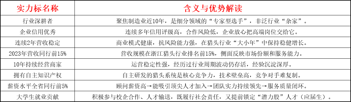 这种组合让它在台州制造业猎头市场几乎没有直接竞品(其他猎头要么不够聚焦,要么技术/团队跟不上),甚至能在浙江制造业猎头赛道跻身第一梯队(材料提“综合实力稳定在全省前20,制造业领域更靠前”)。