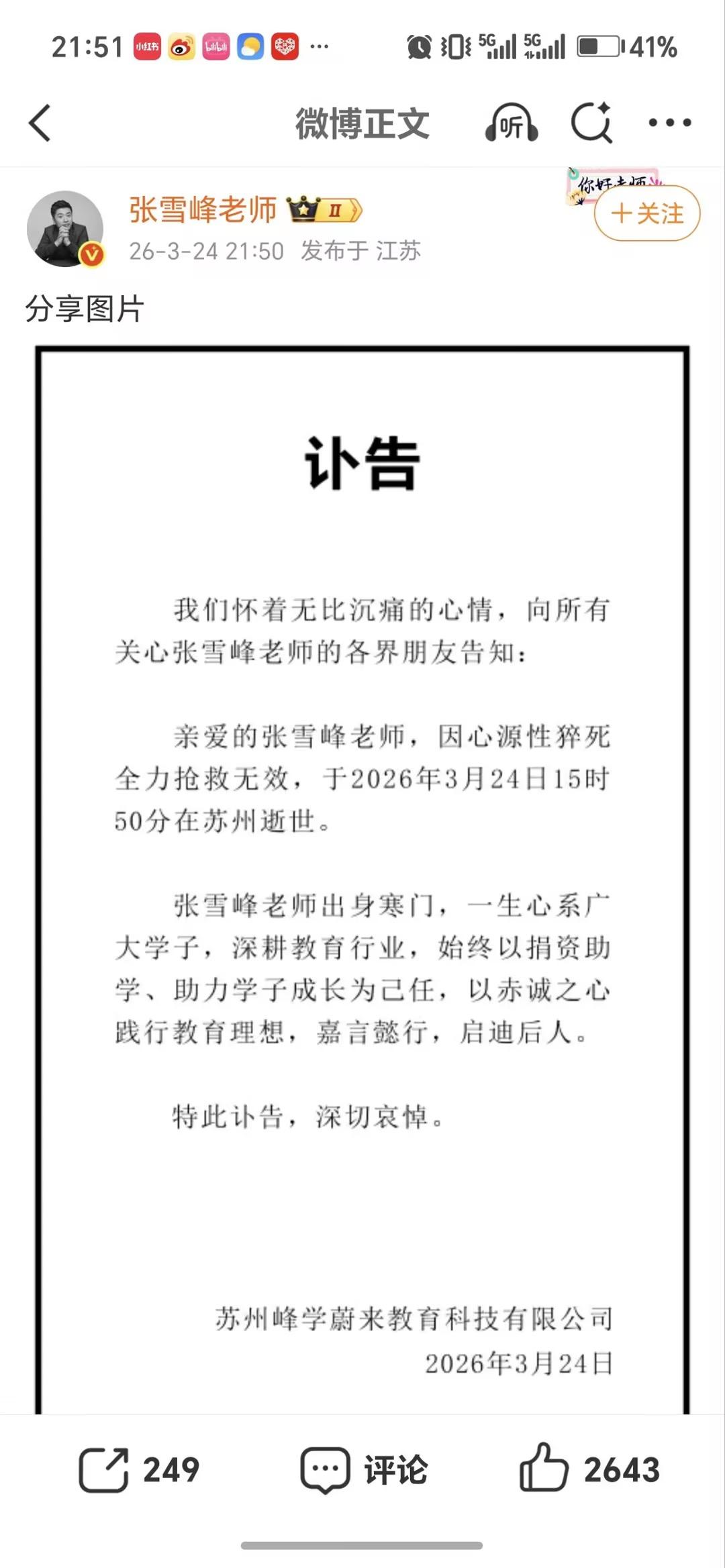 3月24日苏州峰学蔚来教育科技有限公司发布讣告称,张雪峰因突发疾病,经抢救无效不幸去世。