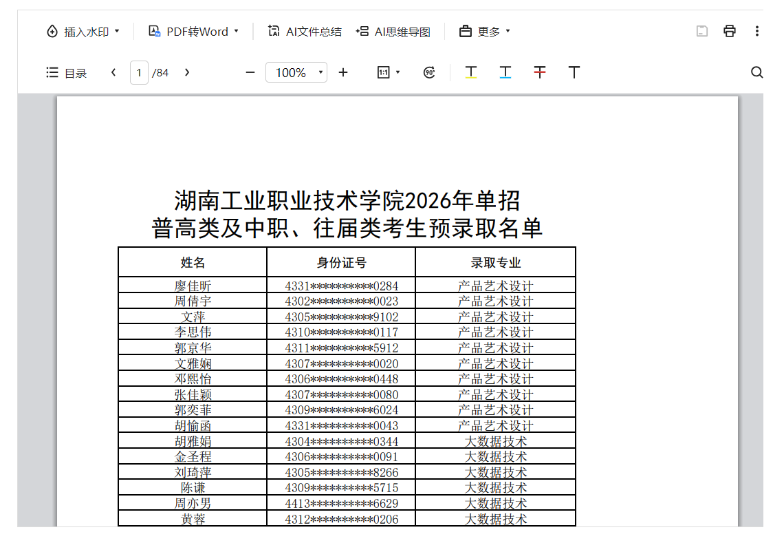 湖南工业职业技术学院2026年单独招生考试预录取名单公示